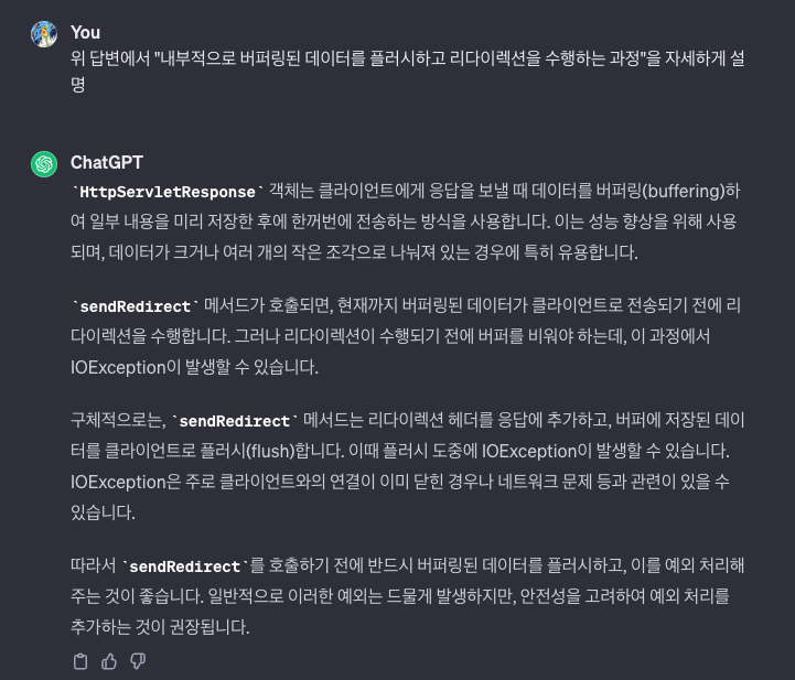 리다이렉션을 수행하기 전에 버퍼를 지우는 과정에서 IOException이 발생할 수 있다는 것이다.