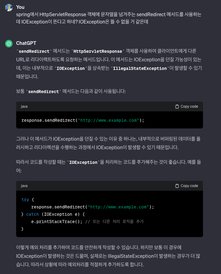 단순한 url을 받는 sendRedirect가 왜 IOException 예외 처리를 해야하는지 궁금했다.