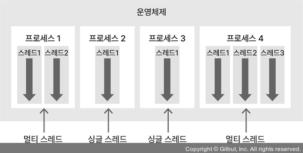 스레드는 프로세스에서 실제로 실행되는 흐름의 단위를 의미한다.
