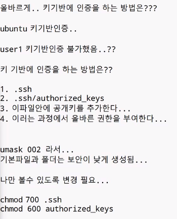 - 위까지가 앞에서 진행했던 내용이고 사실은 ubuntu계정으로 /home/user1에 접근해서 .ssh 폴더를 만들고 공개키를 등록하면 된다.(공개키는 user1의 개인키로 생성된 것으로 받아야겠지?)