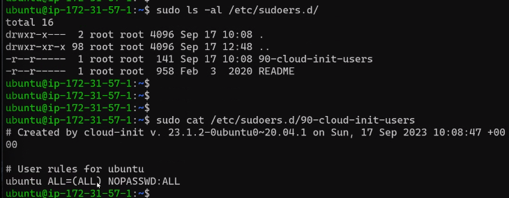 sudo cat /etc/sudoers.d/90-cloud-init-users에 보면 알 수 있다.