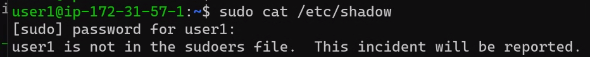 위 그림처럼 password를 요구한다. 실패한다면 This incident will be reported.에서 알려줬듯이 비인가 접근을 로그에 기록한다. 어디서 확인하냐? /var/log/auth.log에 남는다.