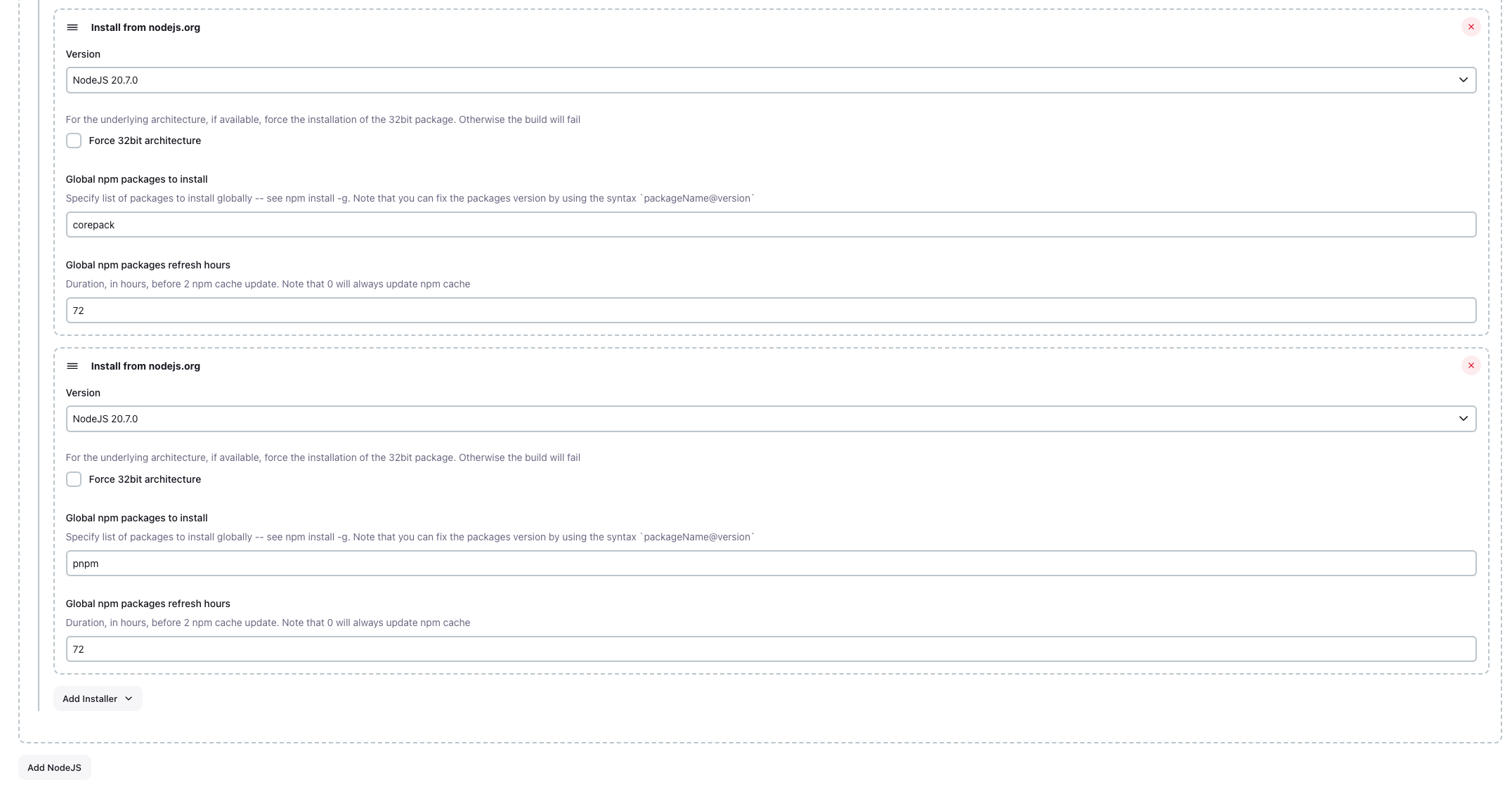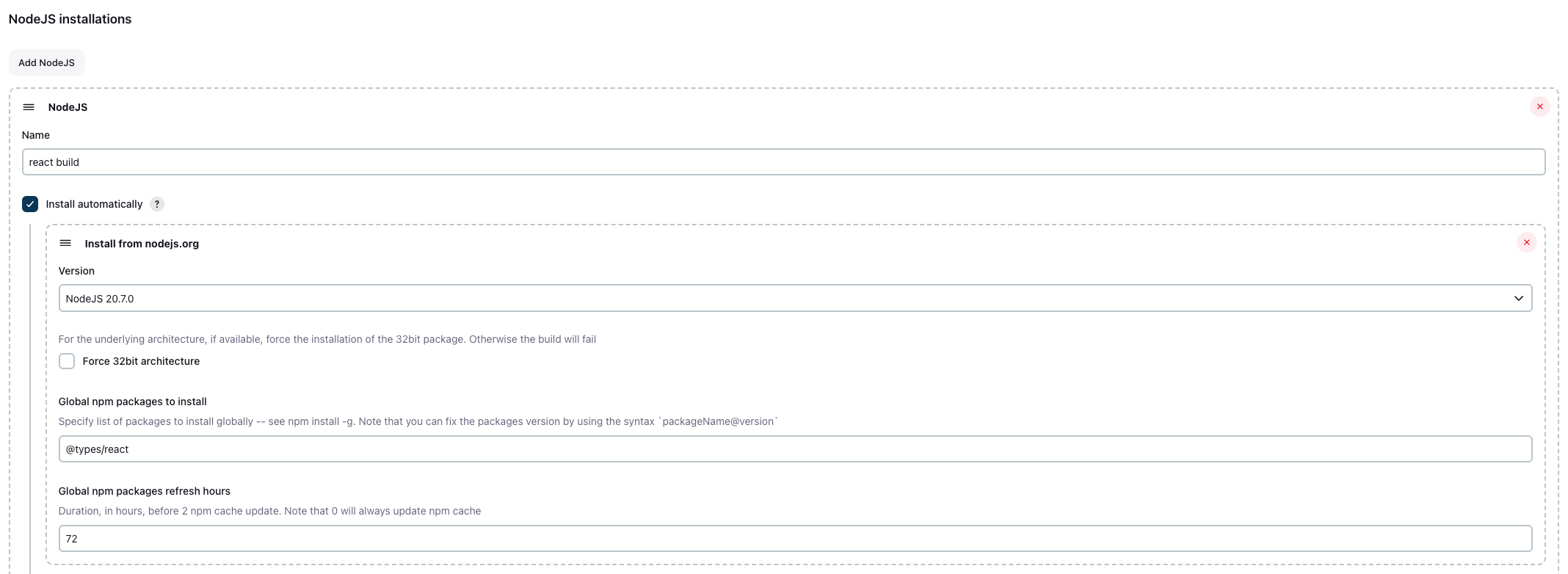 플러그인 설치 후 Dashboard -> Jenkins 관리 -> Tools 에서 NodeJS 설정에 다음을 추가합니다.