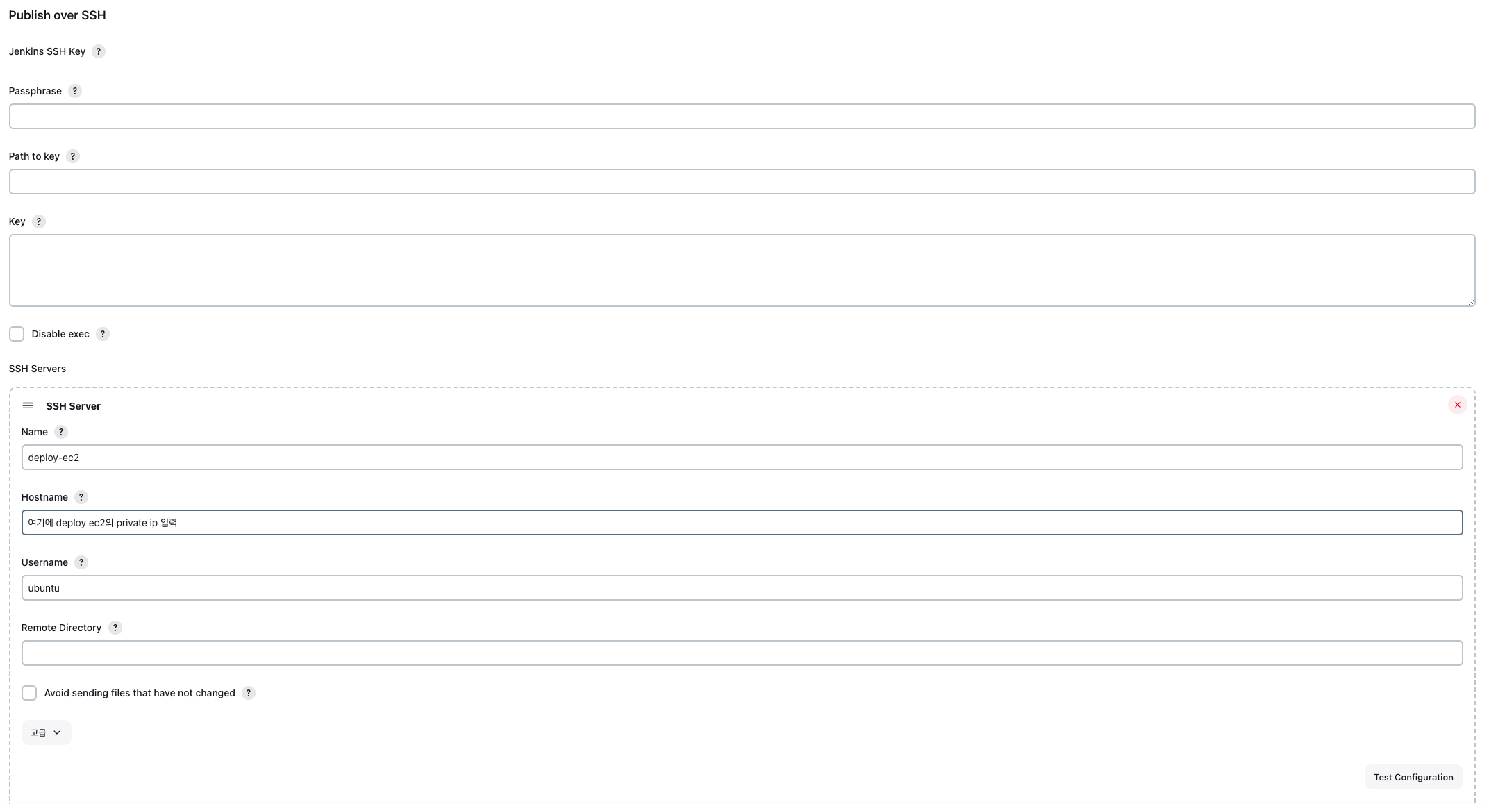 다음으로 Dashboard -> Jenkins 관리 -> System에서 Publish over SSH 설정을 합니다.