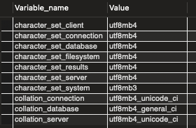 SHOW GLOBAL VARIABLES WHERE Variable_name LIKE 'character\_set\_%' OR Variable_name LIKE 'collation%';